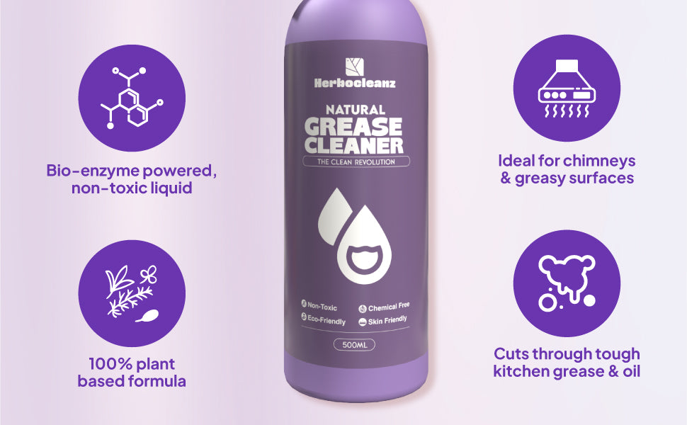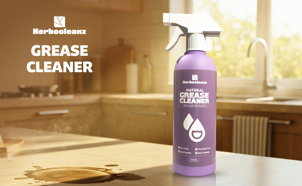 Herbocleanz Natural Grease Cleaner is a powerful, plant-based spray designed to dissolve sticky oil, grime, and stubborn cooking stains from kitchen surfaces. It breaks down grease instantly while keeping your air and hands safe.