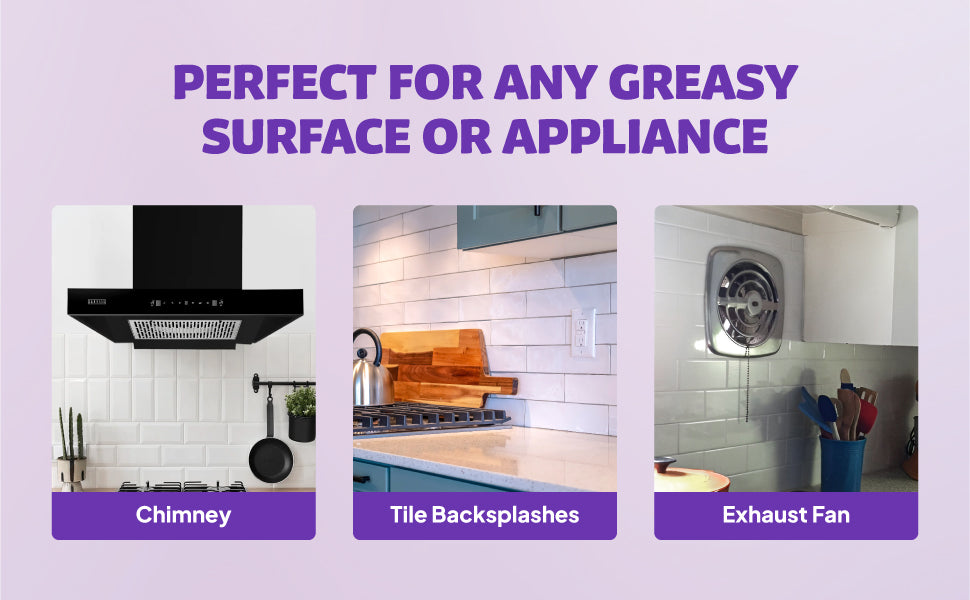 - Dissolves oil, smoke stains, and cooking residue in seconds