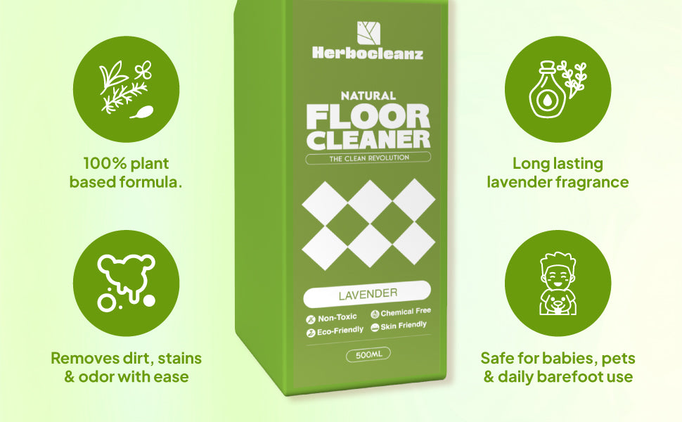 Herbocleanz Natural Floor Cleaner in Lavender is a non-toxic, biodegradable formula that removes stains, dirt, and grime from various floor surfaces while leaving behind a mild, calming lavender scent. Safe for everyday use in homes, schools, and clinics.