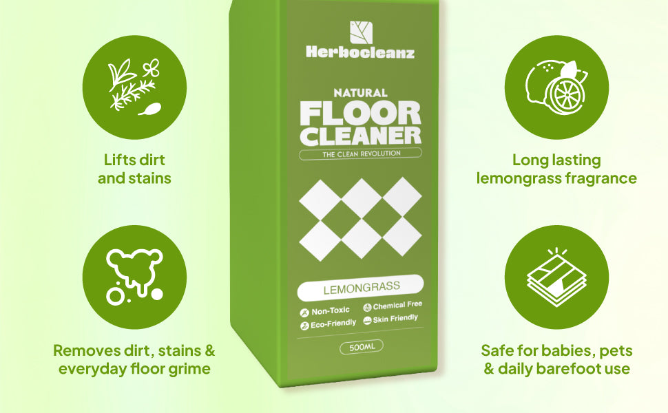 Herbocleanz Natural Floor Cleaner in Lemongrass is a plant-powered, non-toxic formula that lifts stains, removes dirt, and helps protect against germs. Its refreshing natural citrus scent leaves your home feeling clean and energized without any synthetic residue.