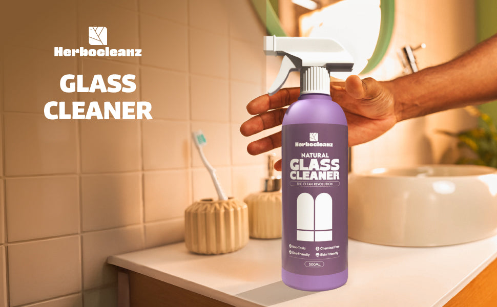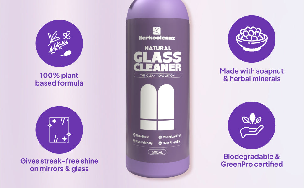 Herbocleanz Natural Glass Cleaner is a plant-based, ammonia-free spray that removes dust, smudges, fingerprints, and water stains from all types of glass and mirror surfaces. It delivers a spotless, streak-free shine with no harsh smell or residue.