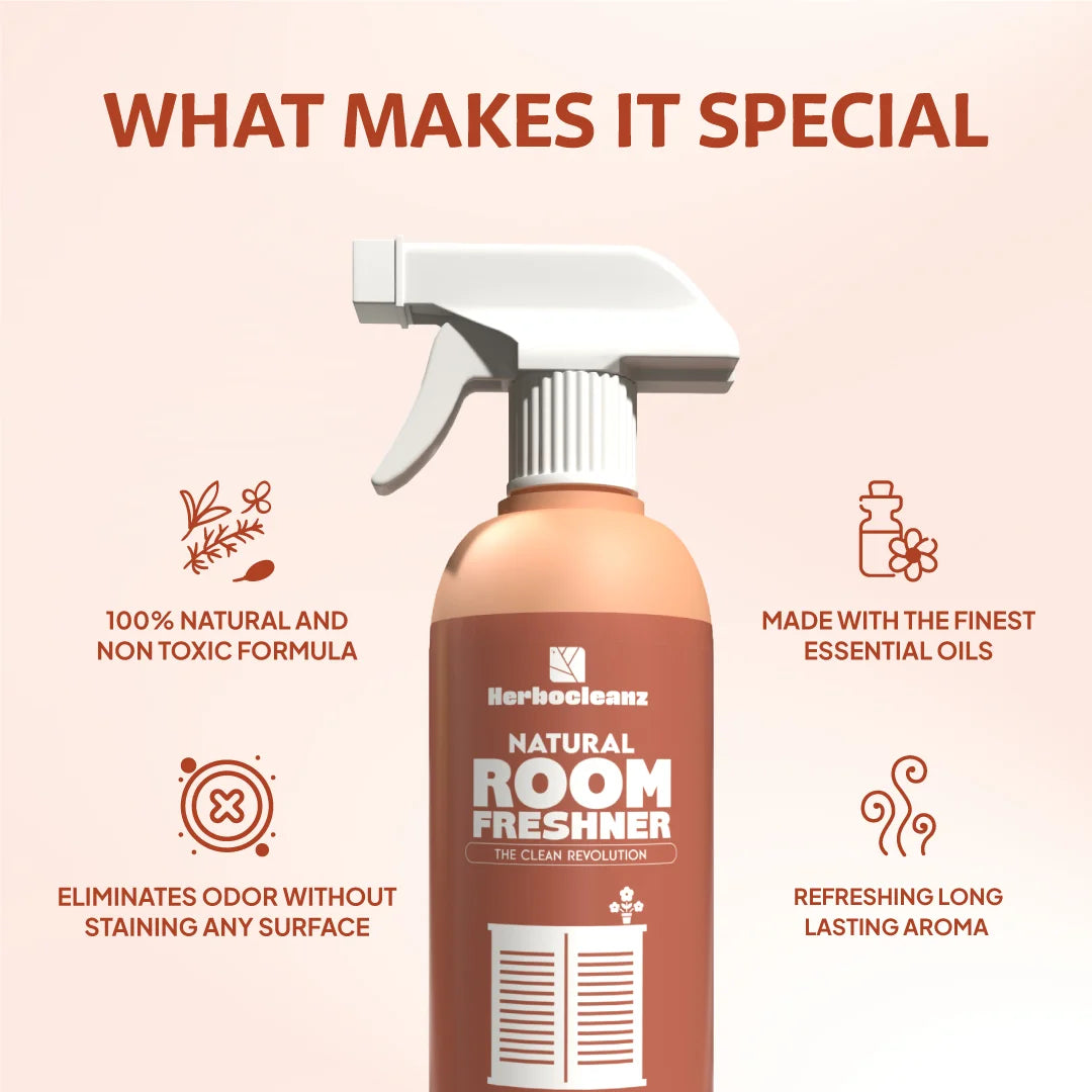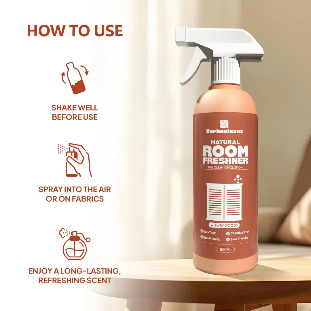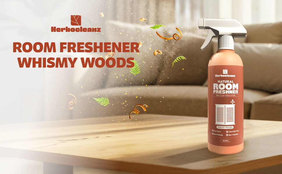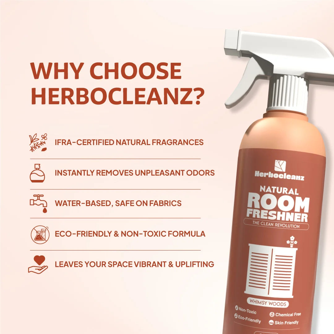 Herbocleanz Room Freshener in Whimsy Woods is a non-toxic, water-based spray made with IFRA-certified fragrance oils and plant-derived actives. It instantly refreshes your room with a grounding, forest-inspired aroma that feels natural, not overpowering.