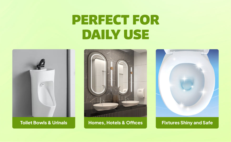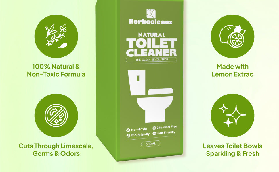 Herbocleanz Natural Toilet Cleaner is a plant-based, non-toxic formula that removes stains, hard water rings, and odors while being gentle on ceramic and safe for regular use. Made with herbal-mineral actives and zero synthetic acids, it’s ideal for homes with kids, pets, and sensitive users.