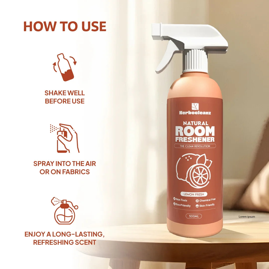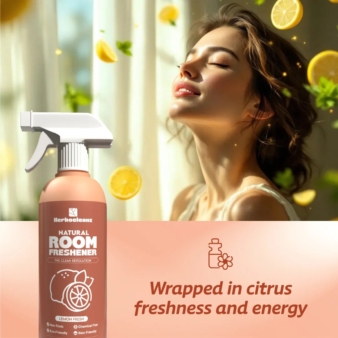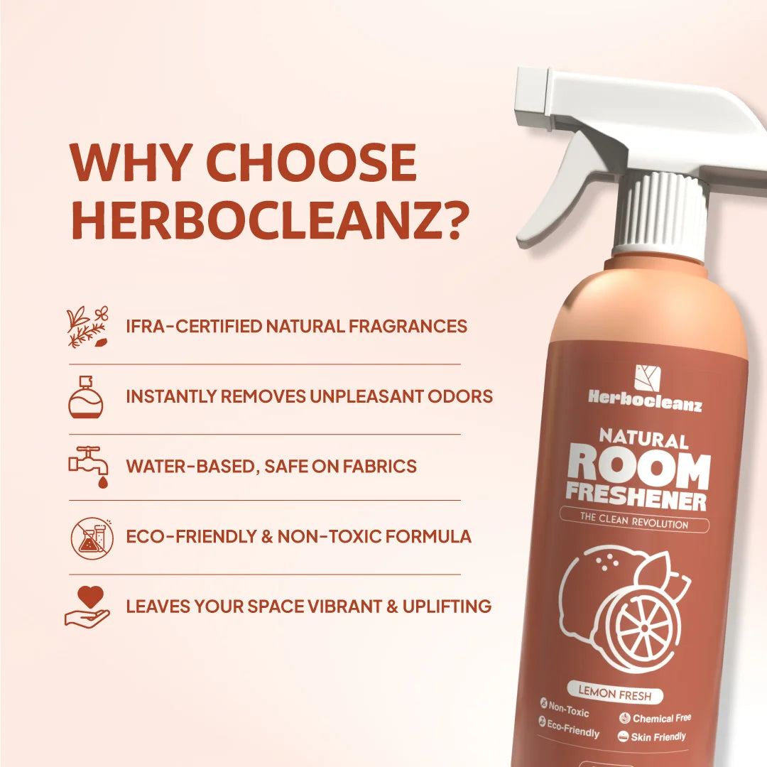 Herbocleanz Room Freshener in Lemon Fresh is a non-toxic, water-based spray infused with natural citrus oils and plant-based actives. It neutralizes odors and energizes your space with a burst of natural freshness.