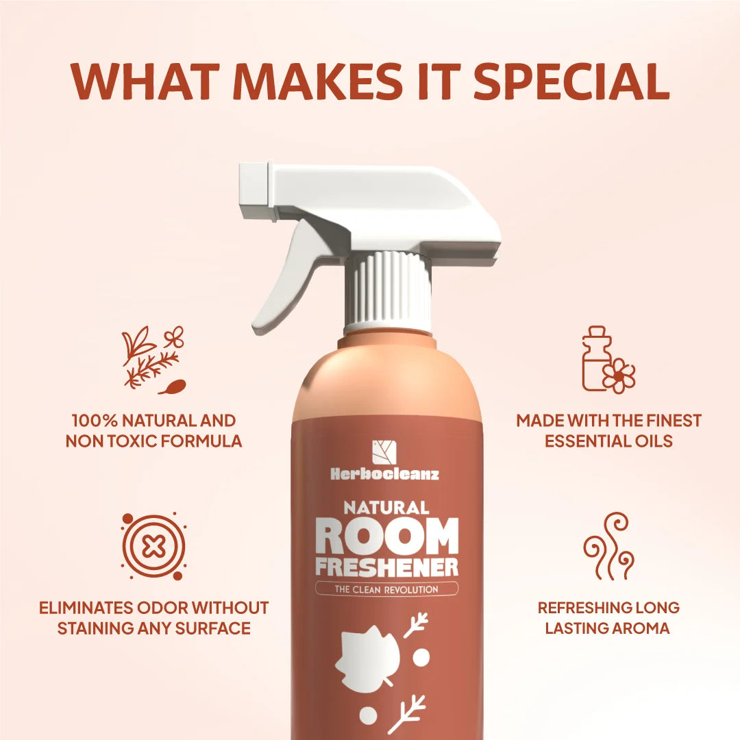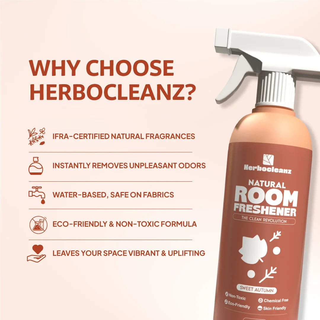 Herbocleanz Room Freshener in Sweet Autumn is a non-toxic, water-based spray that brings a soft, nostalgic fragrance inspired by crisp air, earthy woods, and dried florals. Crafted with safe, IFRA-compliant fragrance oils and zero harsh chemicals.